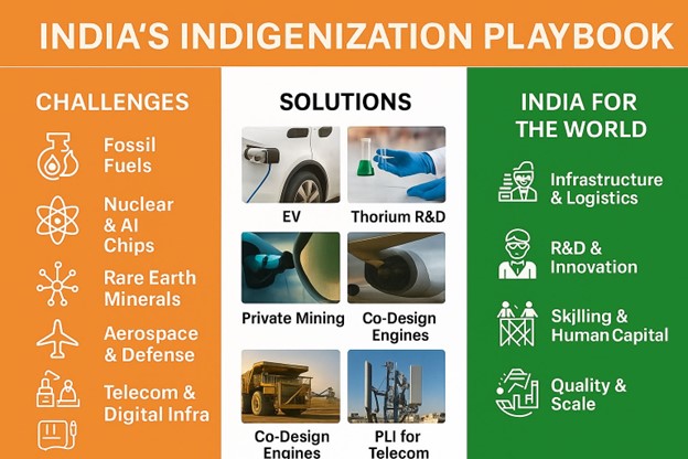 Indigenization ≠ isolation. It’s strategic autonomy + export scale. India must pair domestic capability (PLI, talent, infra) with global alliances (US-iCET, Quad, EU Green Tech) to lead future-ready, diversified supply chains.