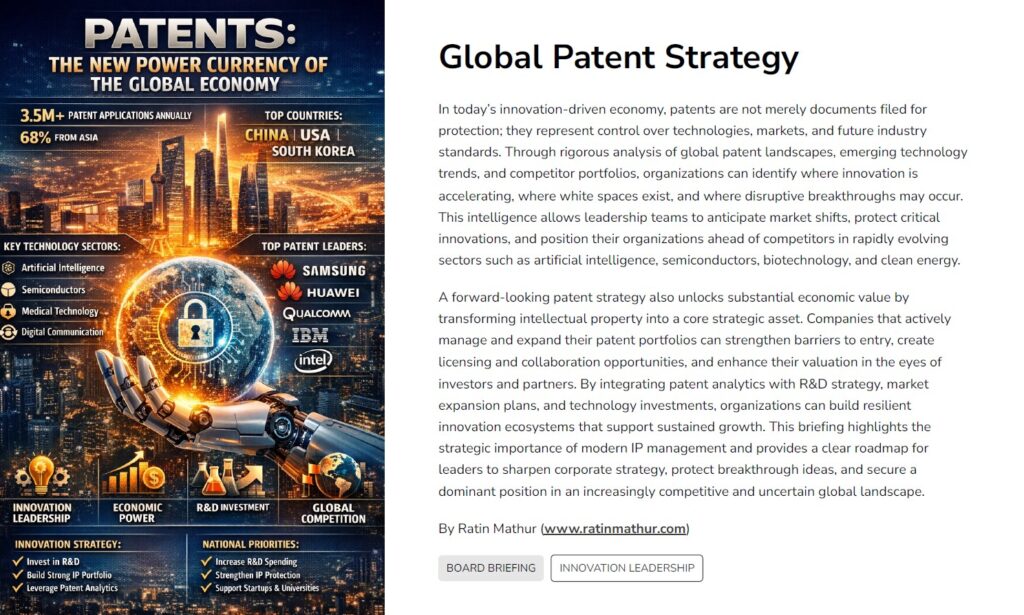 Patents represent a powerful indicator of technological capability and economic competitiveness in the modern world. As innovation becomes increasingly central to economic growth, intellectual property strategy will play a critical role in determining which organizations and countries lead future technological revolutions.