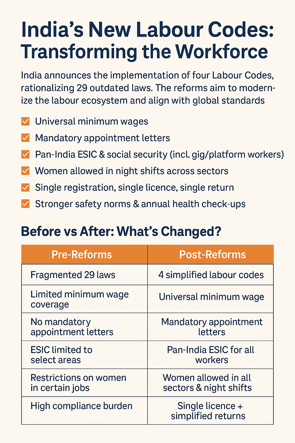 The Government of India has implemented four consolidated Labour Codes—Wages (2019), Industrial Relations (2020), Social Security (2020), and OSHWC (2020)—effective 21 Nov 2025, replacing 29 fragmented labour laws. This overhaul aims to modernise India’s labour market, expand social protection, and reduce compliance complexity, strengthening India’s competitiveness and supporting Aatmanirbhar Bharat.