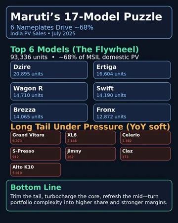 Indiaโ€™s #1 Maruti Suzuki India Limited has 17 nameplates (models), yet only six are powering roughly two-thirds of the story, while seven are sharply down year-on-year (July’2025 domestic PV sales). That isnโ€™t just a sales mix quirk; itโ€™s a strategy tax: overlapping bodies, variant sprawl, diluted marketing, and slower dealer turns.