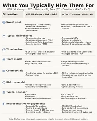 MBB (McKinsey & Company, Boston Consulting Group (BCG), Bain & Company) vs Big-4 (Ernst & Young (EY), Deloitte, KPMG, PwC) โ when to use which