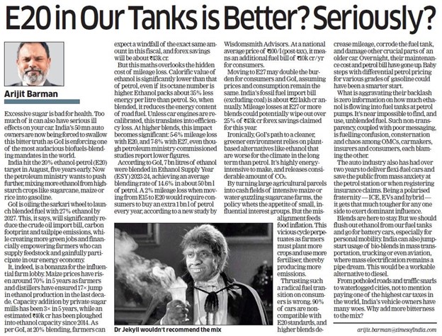 After reading arijit barman analysis in ๐˜›๐˜ฉ๐˜ฆ ๐˜Œ๐˜ค๐˜ฐ๐˜ฏ๐˜ฐ๐˜ฎ๐˜ช๐˜ค ๐˜›๐˜ช๐˜ฎ๐˜ฆ๐˜ด, Iโ€™m convinced mandatory E20 ethanolโ€“petrol hurts consumers, cars, andโ€”ironicallyโ€”climate goals.